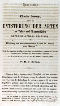 Während Darwins Reise auf dem Schiff „Beagle“ in den 1830er Jahren sammelte er erste Hinweise für seine Vorstellungen. Er vermehrte diese später durch Experimente und wissenschaftliche Schriften. Nach der Erstausgabe 1859 veröffentlichte Darwin bis 1872 sechs Auflagen. Sie enthalten jeweils seine Verbesserungen und Korrekturen und tragen den bis heute gültigen kurzen Originaltitel: „The Origin of Species“. In späteren Ausgaben seines Buches führte Darwin evolutionäre Vorstellungen bis auf Aristoteles zurück. Auch Namen wie Goethe und Lamarck oder auch Darwins Großvater tauchen auf, mit ähnlichen oder gleichen Theorien, denen nur teilweise der Beweis fehlte. Die erste deutsche Übersetzung veröffentlichte der Heidelberger Paläontologe H.G. Bronn nach der 2. englischen Auflage. Ab der 4. Auflage fertigte der Zoologieprofessor J. Viktor Carus, der mit Darwin persönlich in Kontakt stand, die weiteren Übersetzungen an. Carus verbesserte bis zu seinem Tod 1903 in zahlreichen Neuauflagen diese Übersetzung. Sie gilt bis heute im deutschen Sprachraum unter dem Titel „Die Entstehung der Arten“ als Standardübersetzung des berühmten Werkes von Darwin.