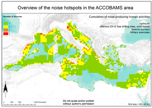 Signifikant ist die Zunahme seismischer Aktivitäten, insbesondere zur Suche nach Öl- und Gasvorkommen. Dabei werden sogenannte Schallkanonen eingesetzt, die Explosionen in einer Intensität von bis zu 260 Dezibel zum Meeresboden hin aussenden. Zum Vergleich: Ein ein Raketenstart verursacht 205 Dezibel. Der Einsatz von Schallkanonen ist zwischen 2005 und 2013 um über 20% auf 27 % der Oberfläche des Mittelmeeres gestiegen. Auch zeigt die Datenauswertung, dass durchschnittlich zu jedem Zeitpunkt mindestens 1500 Schiffe unterwegs sind, ohne die zahlreichen Freizeitschiffe und Fischerboote vollumfänglich mit einzurechnen.