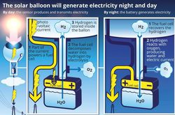 Ein Teil des bei Tag erzeugten Sonnenstrom erzeugt in einer Brennstoffzelle aus Wasser Dessen Komponenten Wasserstoff und Sauerstoff. Den Wasserstoff speichert die Anlage im Ballon, der dadurch Auftrieb erhält. Nachts verkehrt sich der Vorgang in sein Gegenteil. In der Brennstoffzelle verbrennt das Gas aus dem Ballon mit Sauerstoff aus der Luft zu Wasser und speist damit die frei werdende Energie am Boden ins Netz ein.