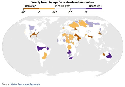 Die jetzt in der Washington Post zitierte Studie belegt: Die Wasservorräte auf der Erde sinken immer weiter. In einem Bericht zitiert die Wochenzeitung Zeitaus dem US-Blatt und zeigt eine Karte der aktuellen Situation. Sie gibt die drastischen Worte der Wissenschaftler wieder: „21 der 37 größten Grundwasservorkommen werden schneller geleert, als Regen oder Schneeschmelze sie wieder auffüllen können.“