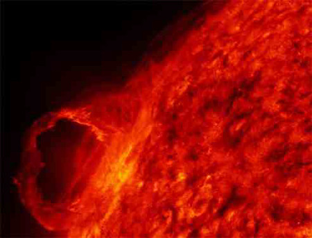 Höllen-Feuer am Himmelsstern: Auf der Sonne tobt ein Sturm. Die stärkste Eruption sei 2003 katapultiert elektrisch geladene Partikel von unserem Tagesstern ins All. Die Teilchen rasen mit 2.200 Kilometern pro Sekunde – und treffen auch die Erde. Obwohl Wissenschaftler der NASA keine schlimmeren Schäden befürchten, kann solch eine starke solare Energieschleuder Satelliten im Orbit außer Funktion setzen und damit etwa die Telekommunikation auf der Erde lahm legen. Was die Forscher auf jeden Fall vorher sagen: Auf der Erde werden beim Eintreffen der Plasma-Wolke von der Sonne vermehrt bunte Polarlichter flimmern!